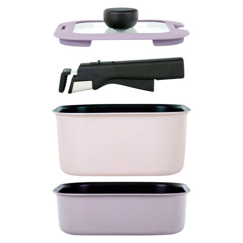 ハンドルが取れる四角いフライパン&鍋セット。スタッキングできるので収納場所を取りません。ハンドルが着脱式なのでオーブン調理も可能です。本体のみ食洗機OK。