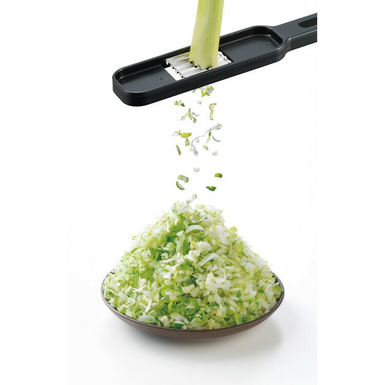 長ネギをいきなりみじん切りにできるスライサーができました。まな板や包丁を出さずに、あっという間にみじん切り。チャーハン、油淋鶏、餃子、麻婆豆腐などの中華料理はもちろん、冷奴や麺類の薬味にも大活躍です。長ネギ専用の安全ホルダー付き。