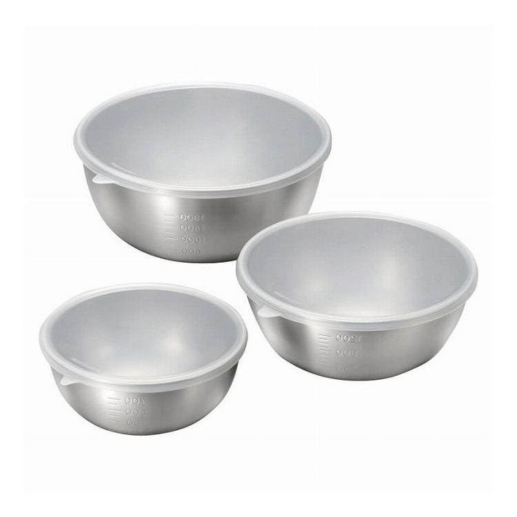金物の街として歴史のある新潟県燕市と三条市。金属加工の技術において世界的に有名な両市の名前を合わせて誕生した「燕三(えんぞう)」は地場生産にこだわったシリーズです。料理の下ごしらえに使いやすいサイズのボール3点セットにシリコーン蓋が付属して、さらに便利。材料やお料理の冷蔵庫保存にも大変重宝します。分量がわかりやすいメモリ付きです。