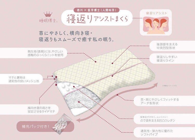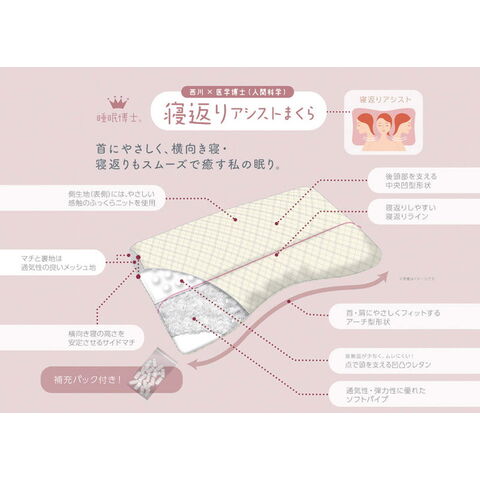 nishikawaが人間科学医学博士監修のもと開発した、自分の寝方で選ぶ「人間科学まくら」睡眠博士シリーズ。人は一晩に20~30回の寝返りを打つと言われております。寝返りアシストは上層部には凹凸の反発性のあるウレタン、下部層には流動性の良いパイプを採用することによりスムーズに寝返りが打ちやすい構造です。