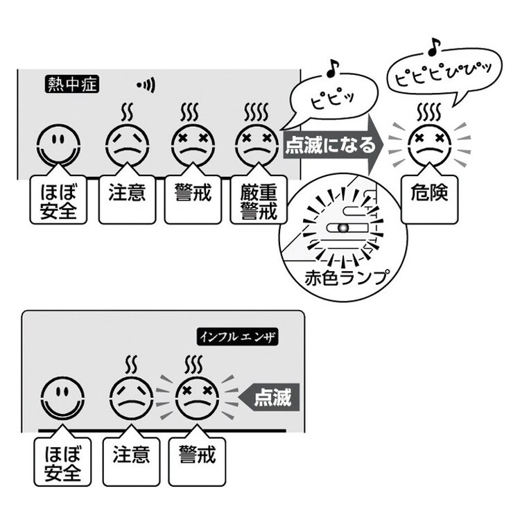 熱中症とインフルエンザ対策に!スリムな薄型デジタル温・湿度計。○温度計・湿度計○熱中症注意目安○季節性インフルエンザ感染防止目安○時刻、カレンダー表示○アラーム機能