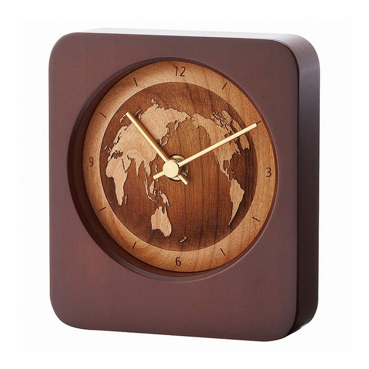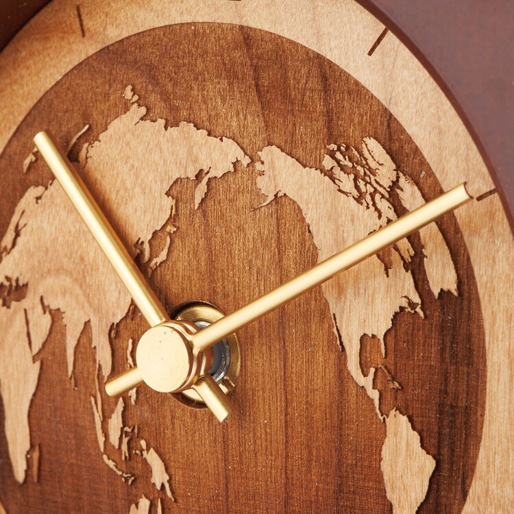 様々なテイストの部屋に不思議なほど馴染む、天然木を贅沢に使用した落ち着きのある風合いが特徴の置時計。世界地図やインデックスはレーザー加工を施したことによって、立体感と絶妙なニュアンスが生まれ味わい深い印象を与えます。