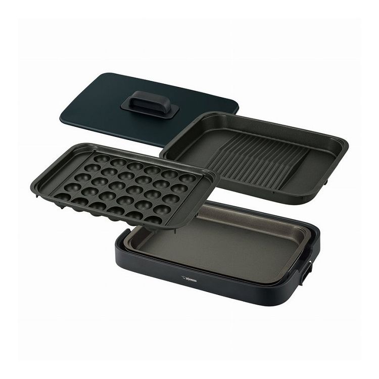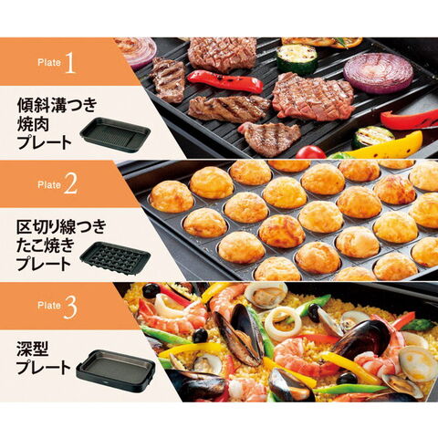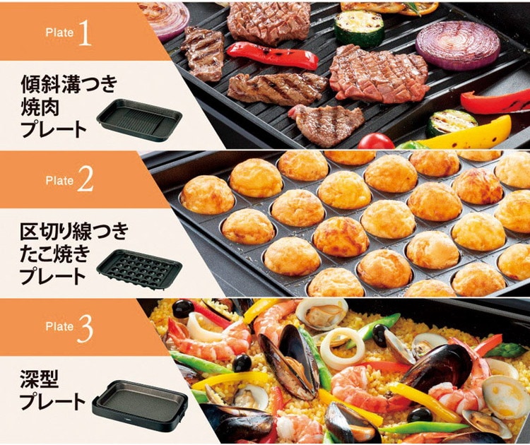 「傾斜溝つき焼肉プレート」「深型プレート」「区切り線つきたこ焼きプレート」の3枚プレートがついています。