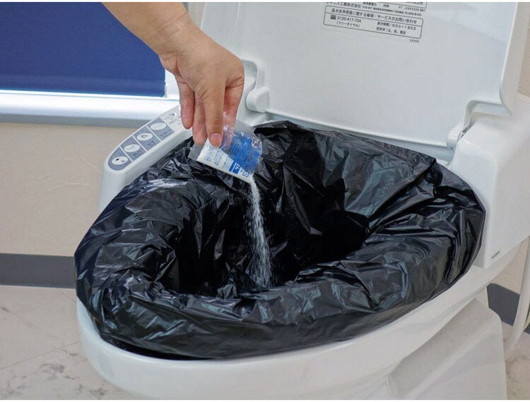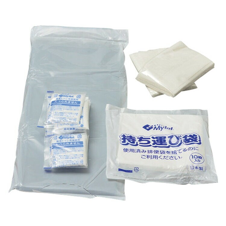 性凝固剤を使い汚物を固めて可燃ごみとして処理できるお手軽サイズの災害用トイレ処理セット10回分です。災害時やキャンプなどのレジャー、ドライブなどの様々なトイレの困ったを解決します。