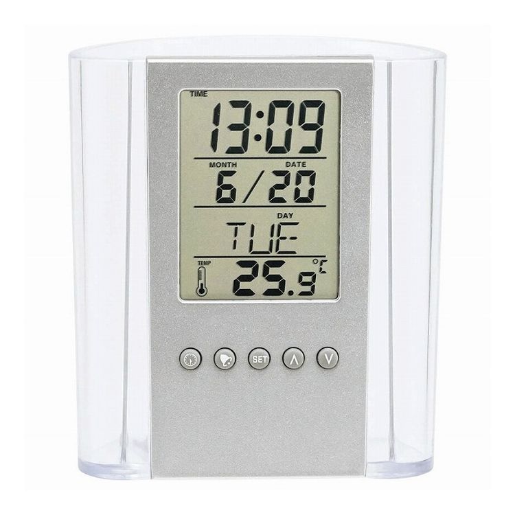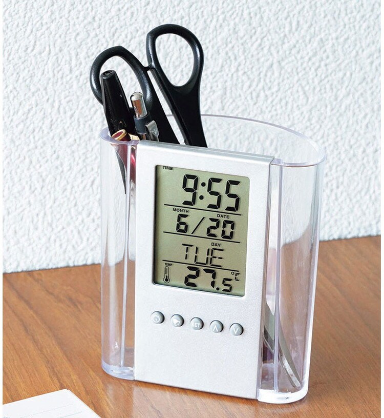 パッと取り出しやすくデスクの上をすっきりと。アラーム機能付。時刻・日付表示・アラーム・タイマー・温度計。