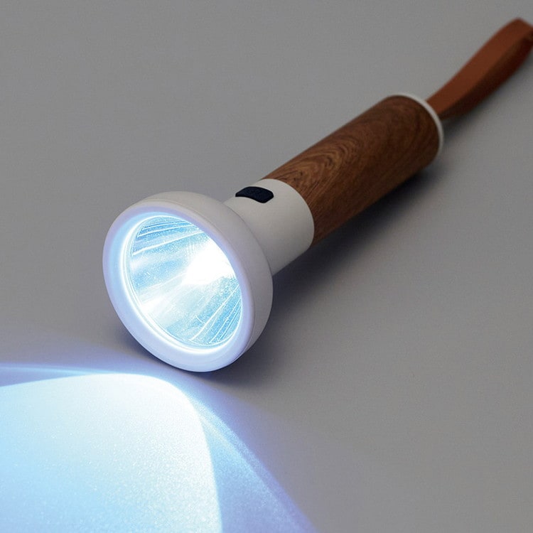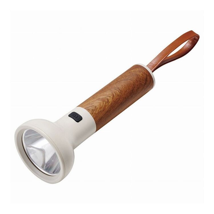 持ち手がウッド調でインテリアにも馴染むオシャレな懐中電灯。災害時にも役立つ強力発光のCOBライト。明るさ:Highモード160ルーメン、Lowモード40ルーメン。照射距離:100メートル(強ライト)~50メートル(弱ライト)。モード:強ライト⇒弱ライト⇒ストロボ。