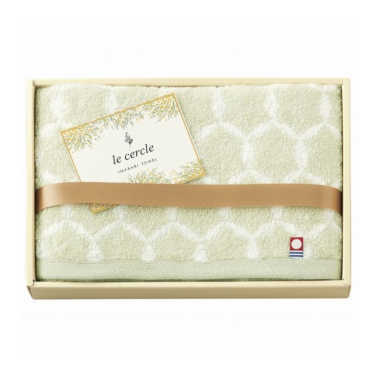 セルクルは、フランス語で「円」を意味します。人とのつながり縁と「円」をかけ合わせ、繋がりながら広がってゆく様を今治産地の特徴でもあるジャカード織で表現しました。落ち着いたグリーンとあたたかみのあるベージュの色の組み合わせはどなたにも喜んでいただけます。