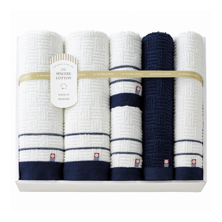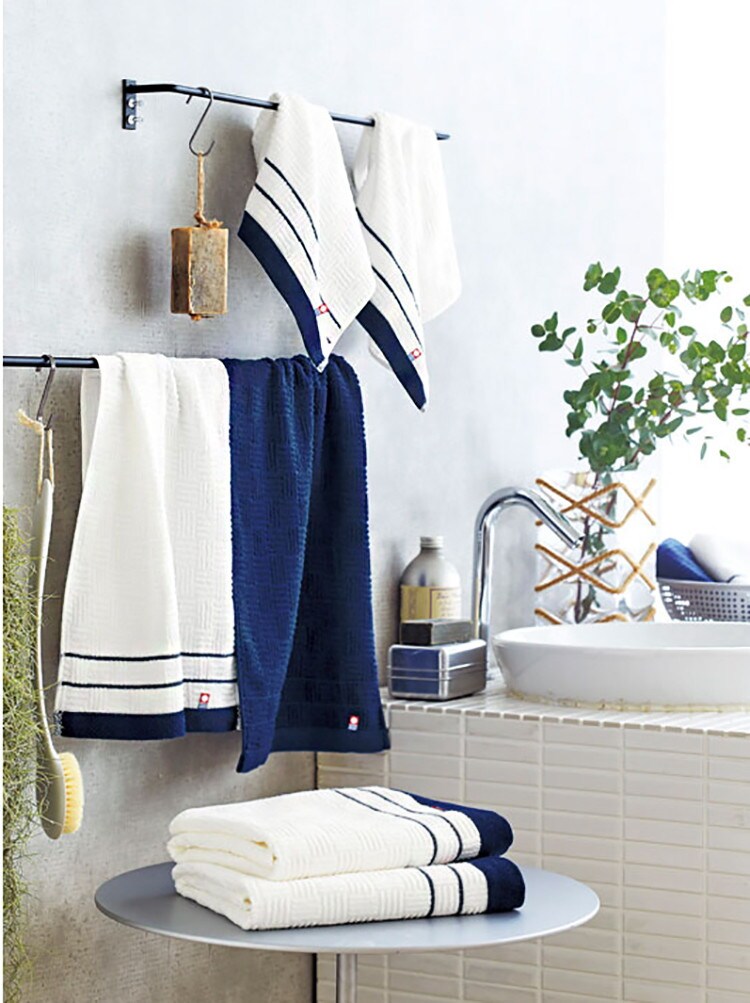 ノーブルな紺色と白色のコントラストが美しい、高級感のあるタオルです。フォーマルでも映えるシックでモダンなデザインが自慢です。