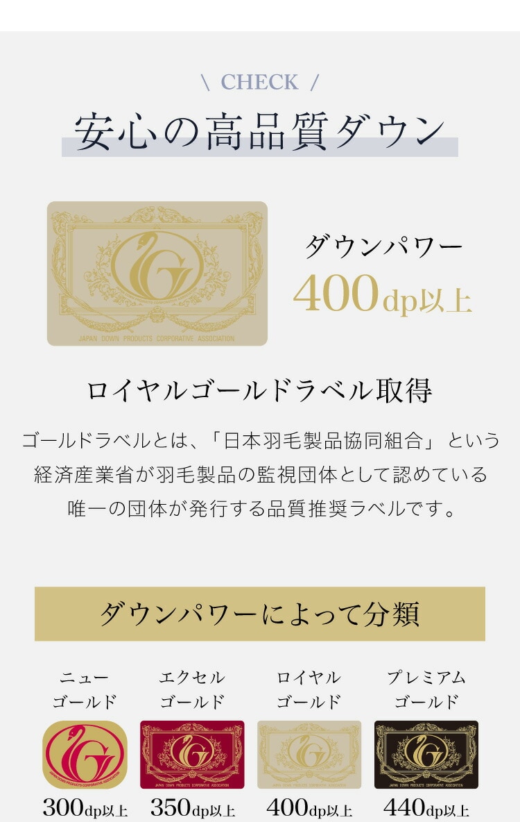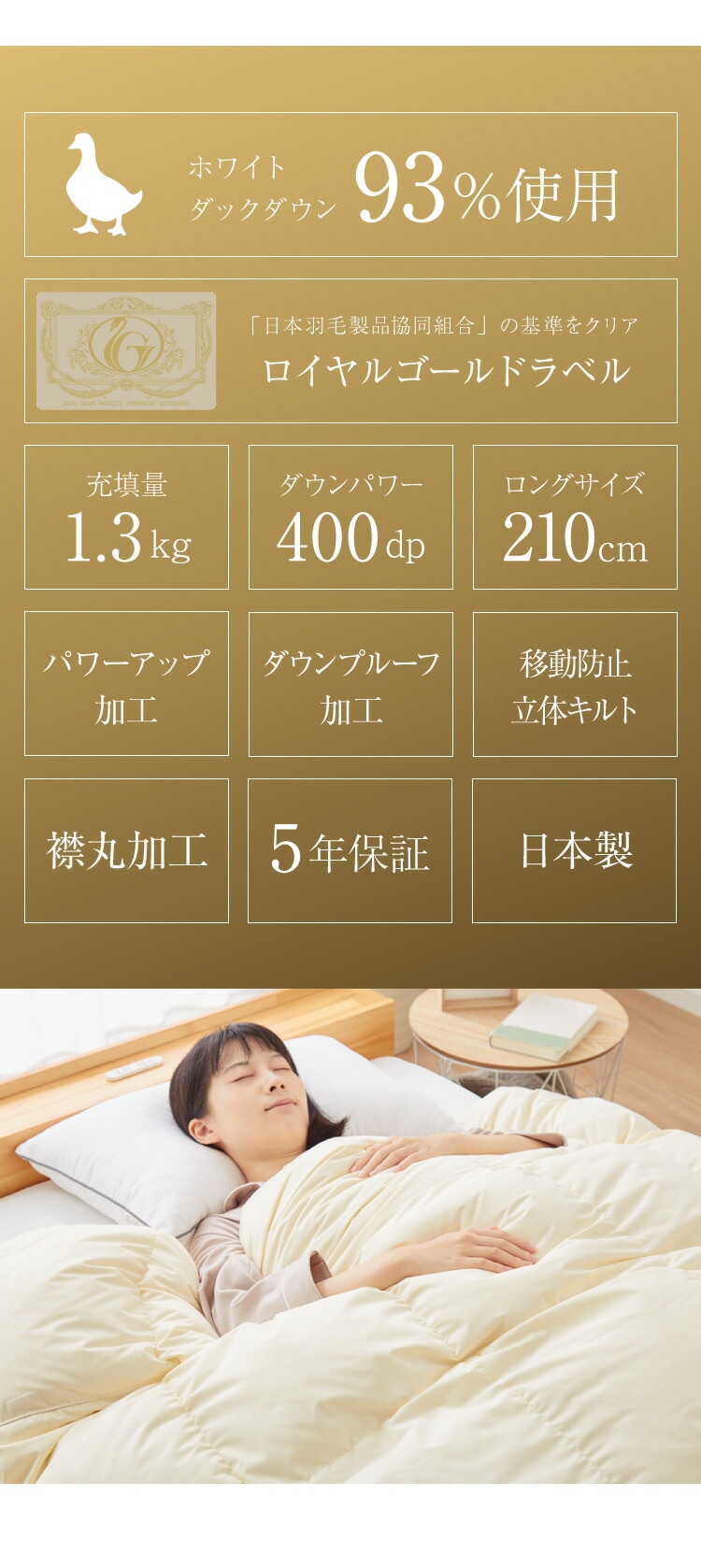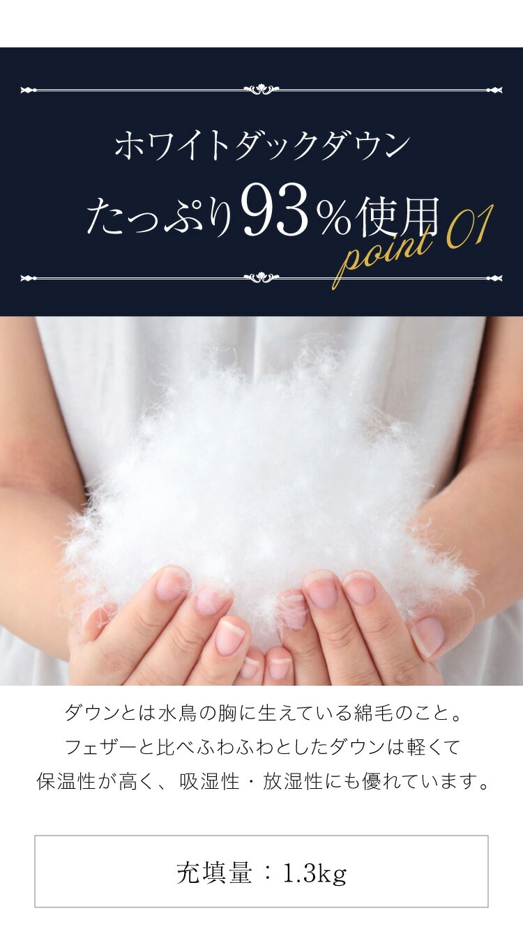 羽毛布団 ロイヤルゴールドラベル 93% 充填量1.3kg 日本製 ホワイトダックダウン ダブルロング 190×210cm ダウンパワー400dp 国産 羽毛ふとん 掛け布団 羽毛 洗える 保温性 高級感 高品質【送料無料】
