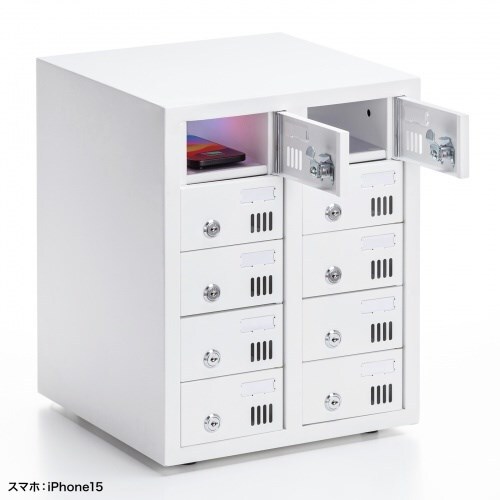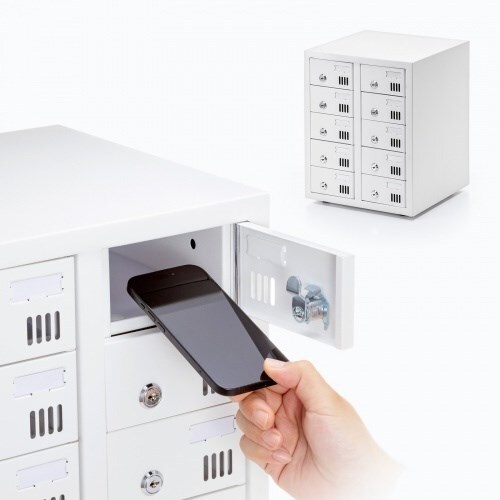 シリンダー錠を各扉に採用。スマートフォンの個別管理に最適。10台収納。
