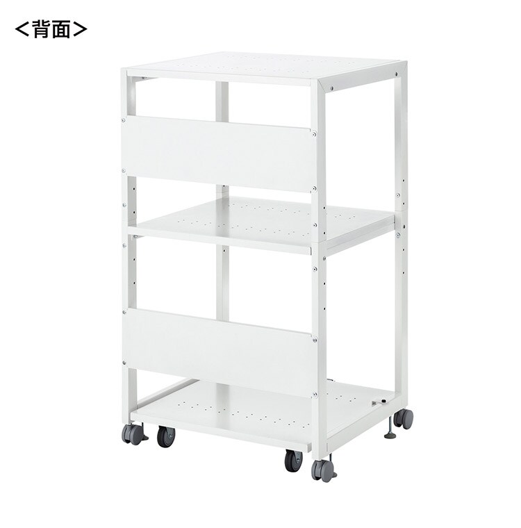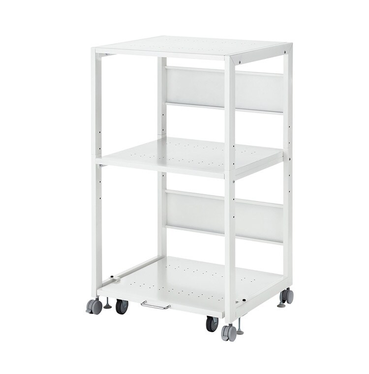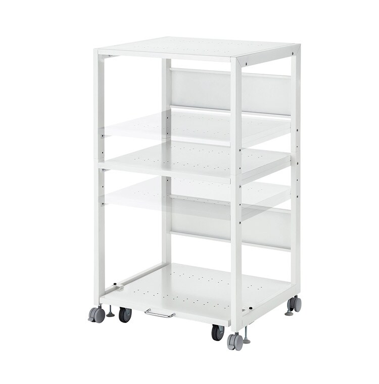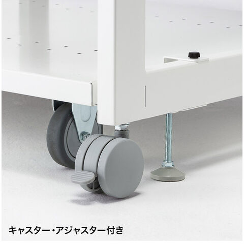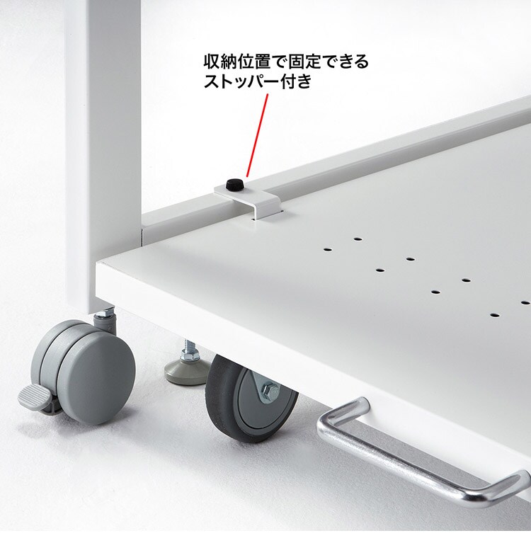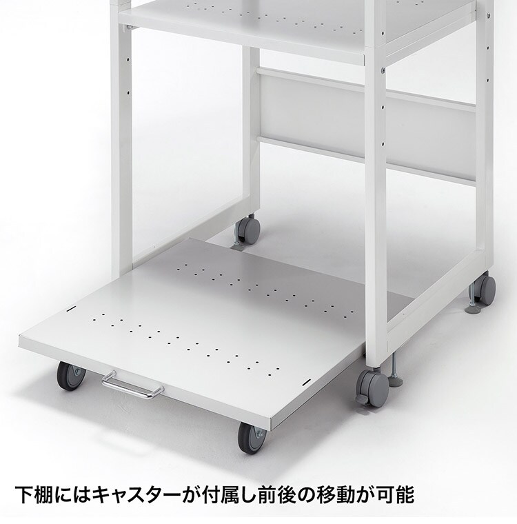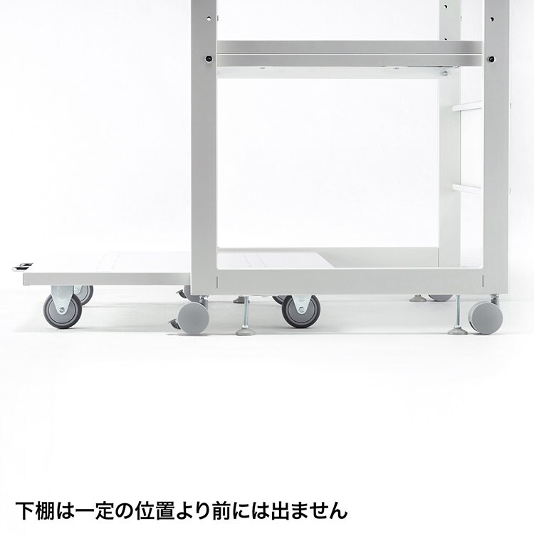 ・下段棚は独立しており、100kgの耐荷重があります。※収納位置で固定できるストッパー付き。キャスターが付属し前後の移動が可能です。下段棚は前後のキャスター間に本体のフレームがあるため一定の位置より前には出ません。