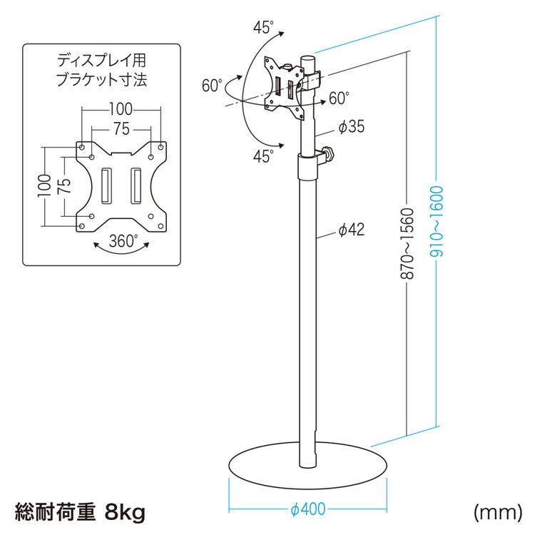 サイズ:W400×D400×H910~1600mm支柱直径サイズ/35mm、下側/直径42mm