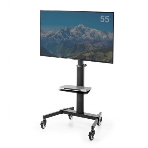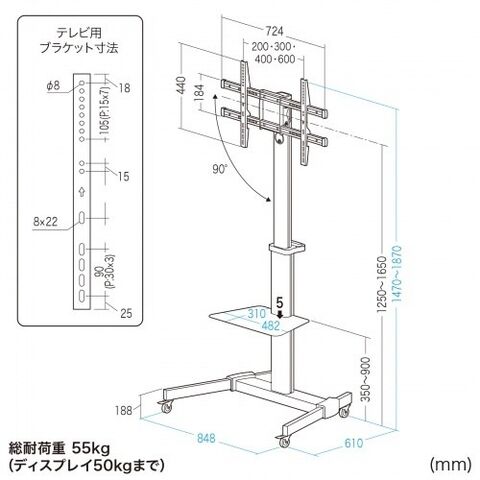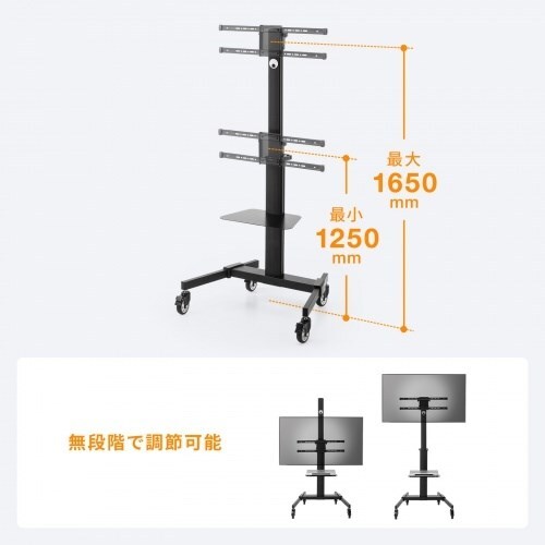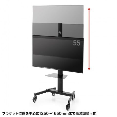初期設定で無段階に高さ設定可能(ブラケット中心1200~1600mm)。90度回転機能付き75型対応ディスプレイスタンド。