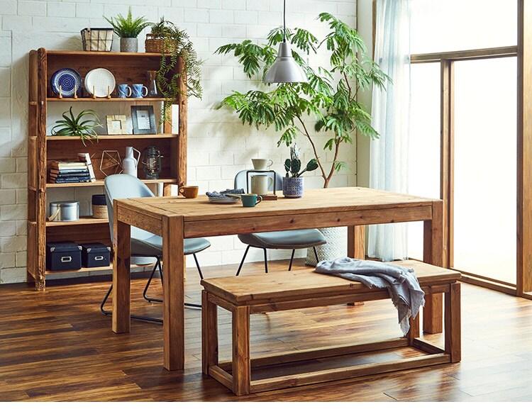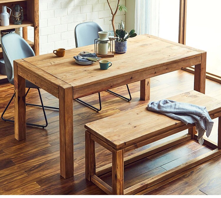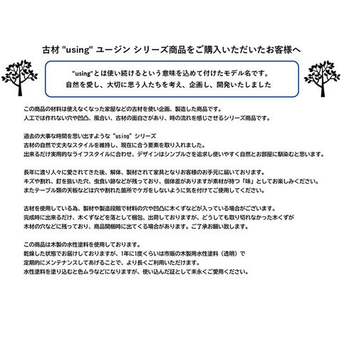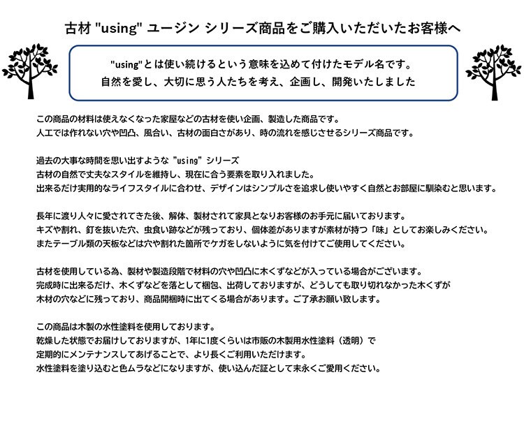 長く使用されたリサイクルパイン材を使用しておりますので釘を抜いた跡や虫食いがございます。又、木の節や傷み具合には個体差がございますので予めご了承下さい。
