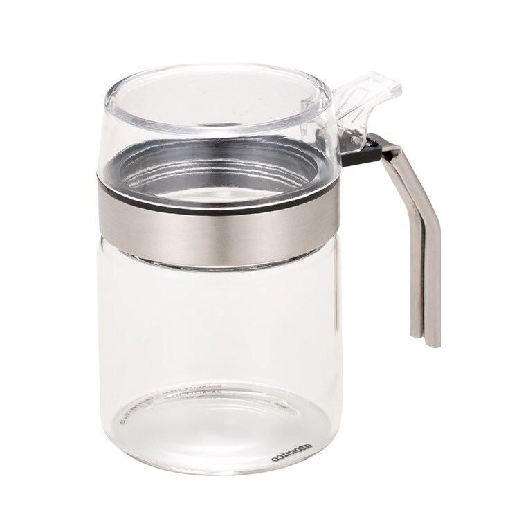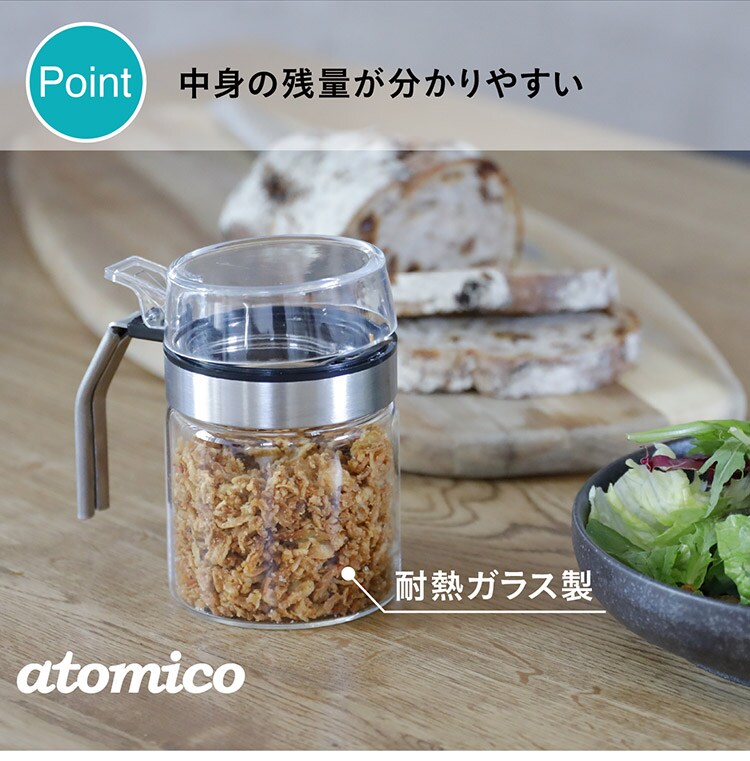 ・耐熱ガラス製で、中身の残量がすぐに確認でき、衛生的でおしゃれなデザインが特徴です。