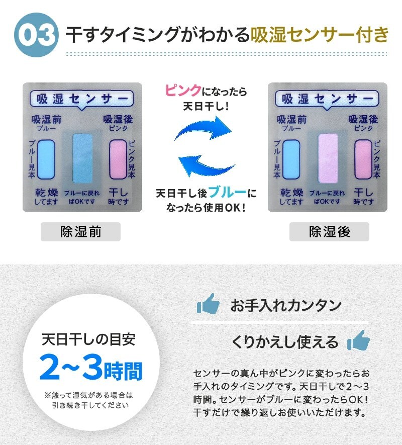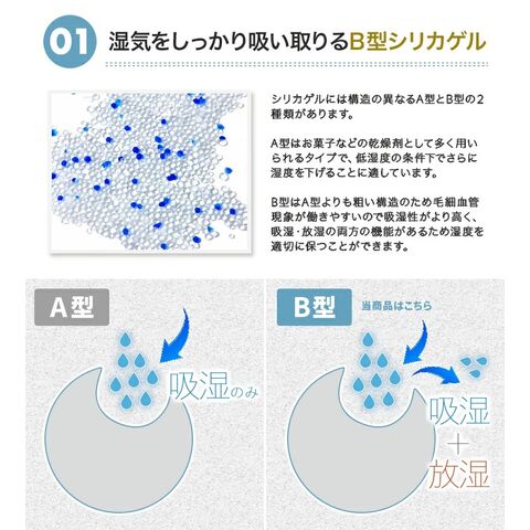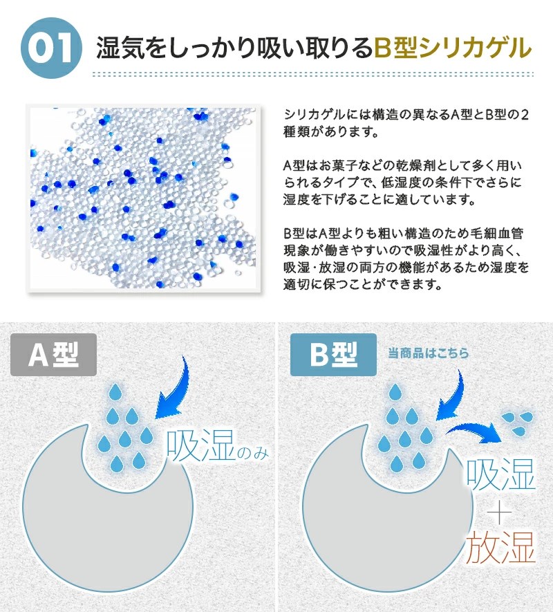 湿気をしっかりと吸い取るB型シリカゲルが吸湿・放湿し