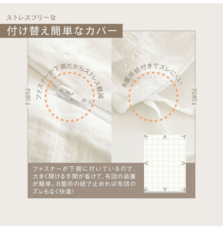 季節を問わず使え、お手入れ簡単で清潔に保てる掛け布団カバーです。