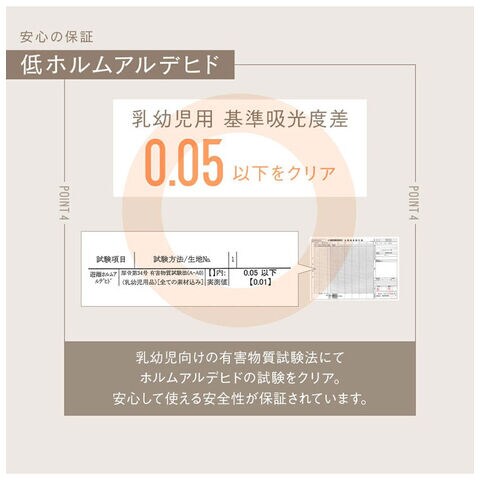 乳幼児向けの有害物質試験法にてホルムアルデヒドの試験をクリア。