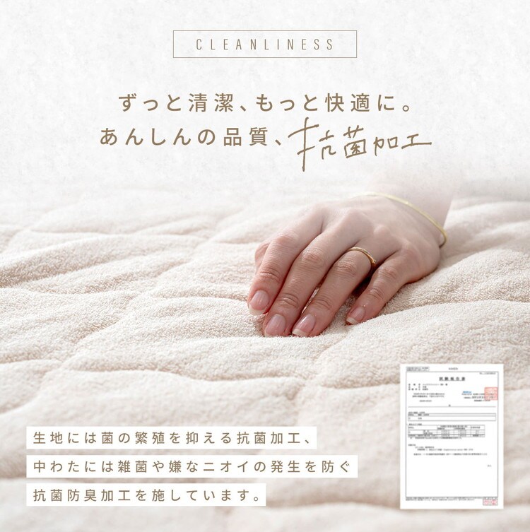 生地には菌の繁殖を抑える抗菌加工、中わたには雑菌や嫌なニオイの発生を防ぐ