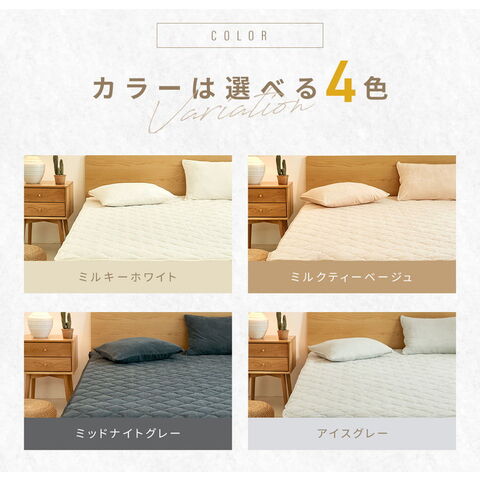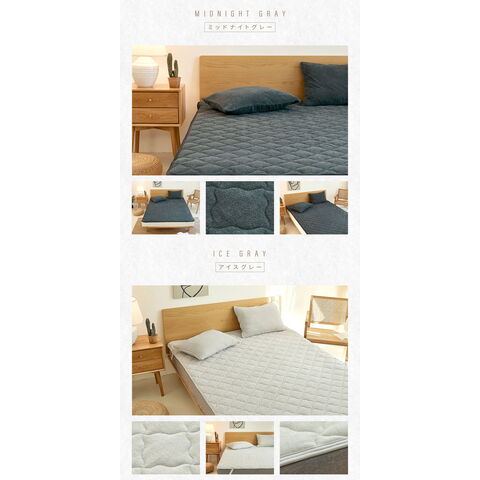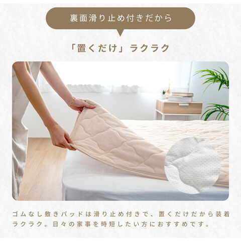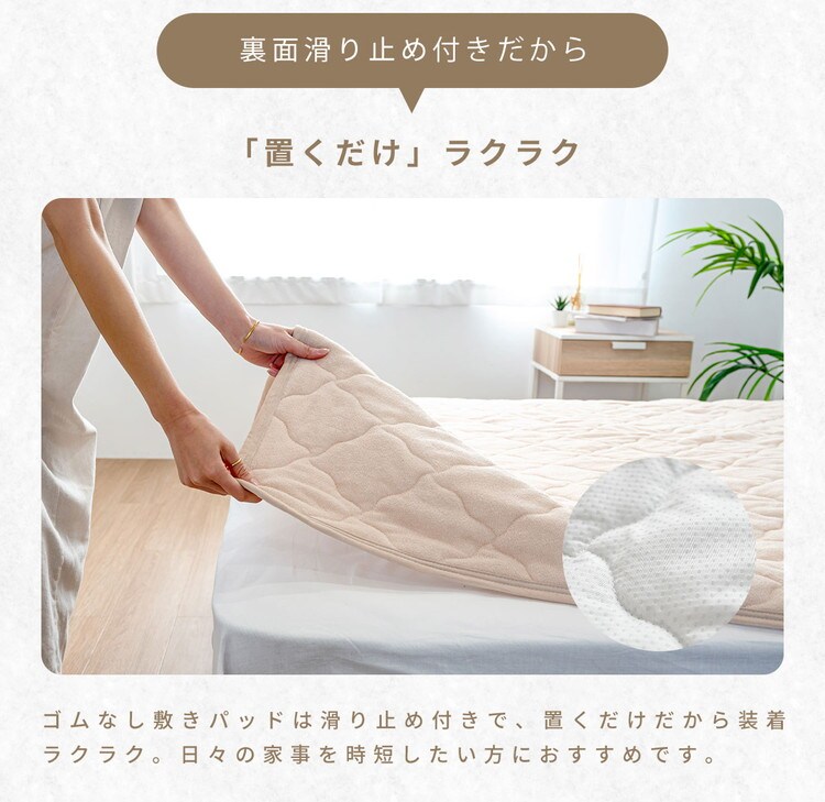 ゴムなし敷きパッドは滑り止め付きで、置くだけだから装着ラクラク。
