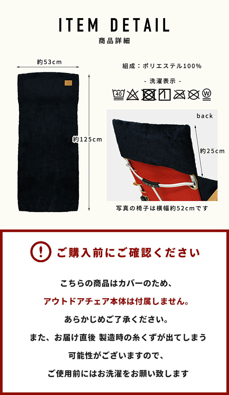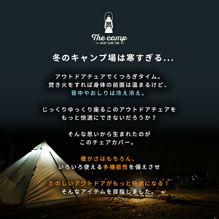 ポケット部分を椅子背面に被せればチェアカバーとなり背中やおしりへの冷気をカット。畳み込めば枕となり、テントでの就寝時や移動中の車内での背当て、仮眠用として大活躍。そのまま膝に掛け、ブランケット代わりにしたり寝袋の中に敷いて防寒対策に使うのもおすすめです。