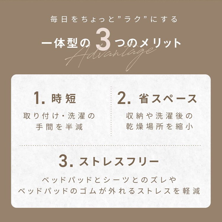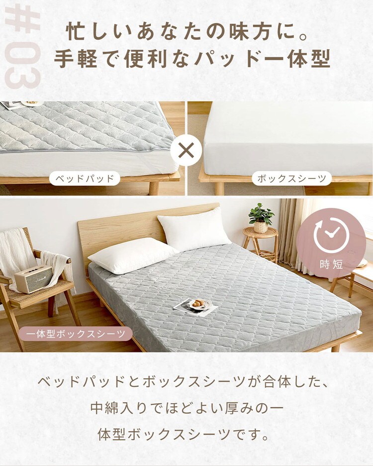 敷きパッドとボックスシーツが一体になったタイプなのでお洗濯や着脱の手間が半分に!
