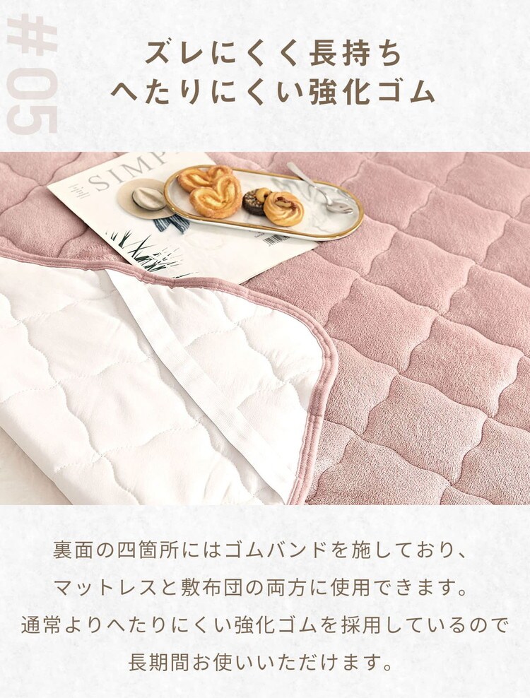 四隅ゴムバンド付きでずれにくく、マットレスにはもちろん敷き布団にもお使い頂けます。