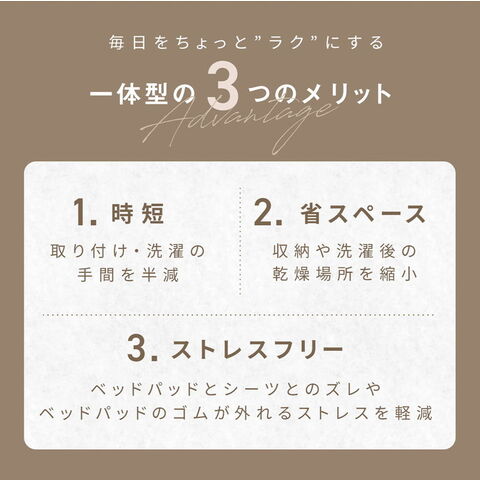 敷きパッドとボックスシーツが一体になったタイプなのでお洗濯や着脱の手間が半分に!