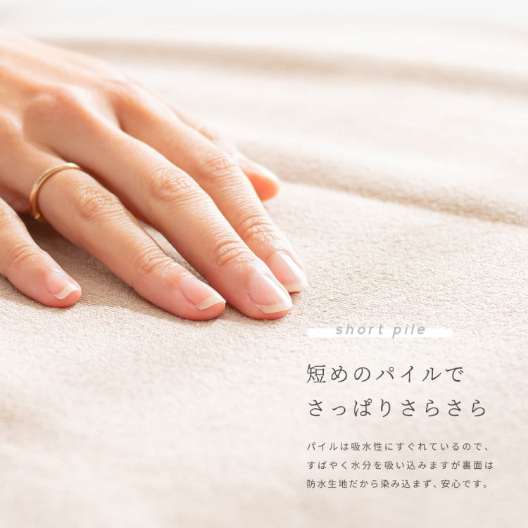 表地はお肌にやさしい安心の綿100%。短めのパイルはさっぱりさらさらとした肌触りで オールシーズンお使いいただけます。吸水性に優れている綿だから、すっと水分を吸い込みますが、裏面が防水生地なので、下に染み込まず安心!
