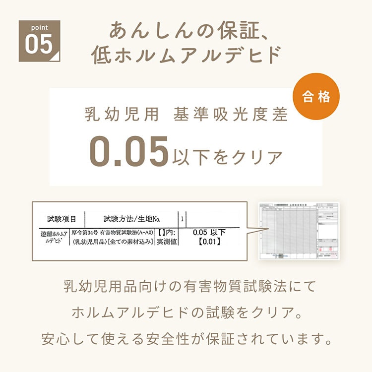 乳幼児用品向けの有害物質試験法にてホルムアルデヒドの試験をクリア。安心して使える安全性が保証されています。