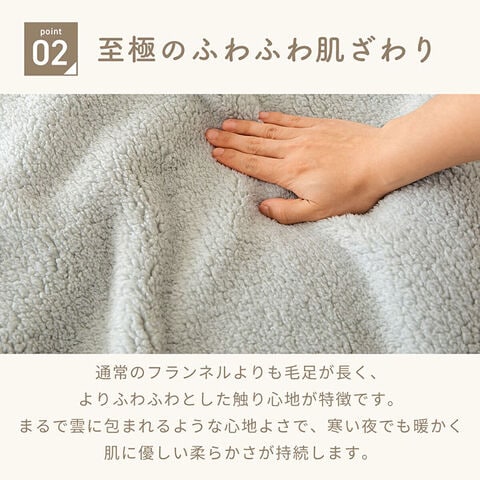 通常のフランネルよりも毛足が長く、よりふんわりとした触り心地が特徴です。まるで雲に包まれるような心地よさで、寒い夜でも暖かく肌に優しい柔らかさが持続します。