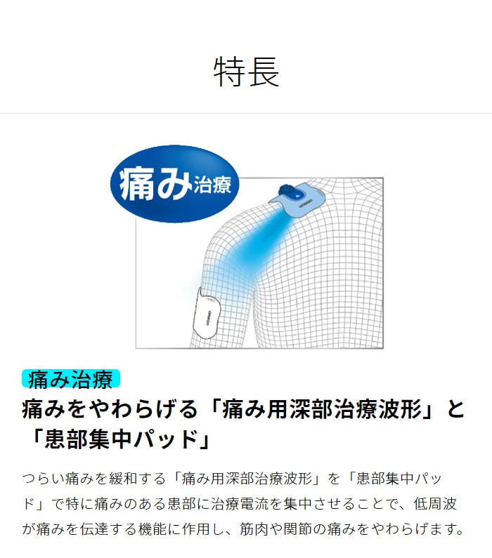つらい痛みを緩和する「痛み用深部治療波形」を「患部集中パッド」で特に痛みのある患部に治療電流を集中させることで、低周波が痛みを伝達する機能に作用し、筋肉や関節の痛みをやわらげます。