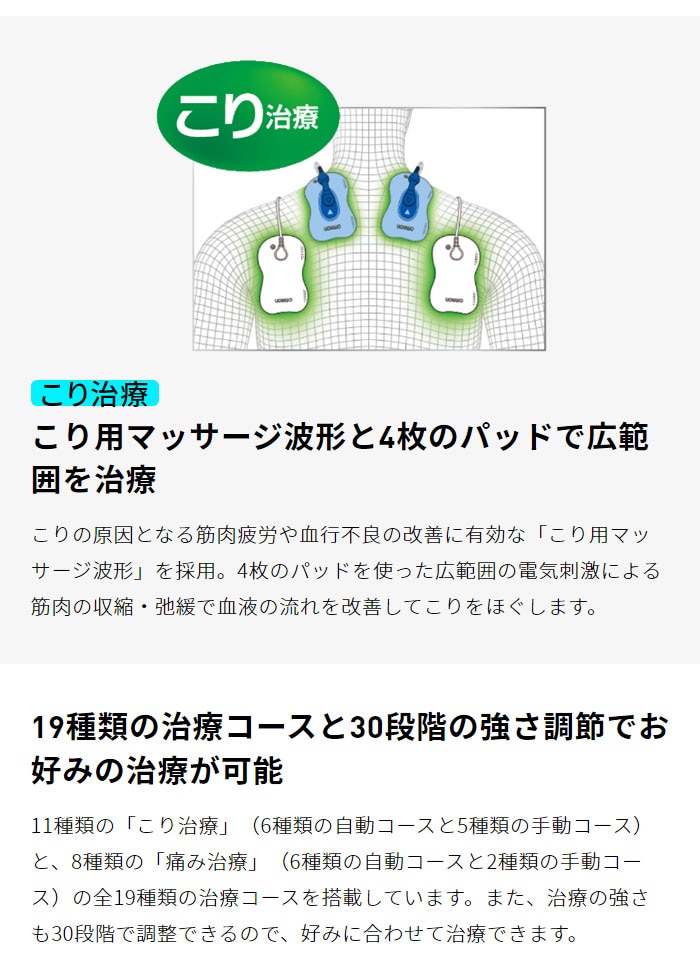 11種類の「こり治療」(6種類の自動コースと5種類の手動コース)と、8種類の「痛み治療」(6種類の自動コースと2種類の手動コース)の全19種類の治療コースを搭載しています。また、治療の強さも30段階で調整できるので、好みに合わせて治療できます。