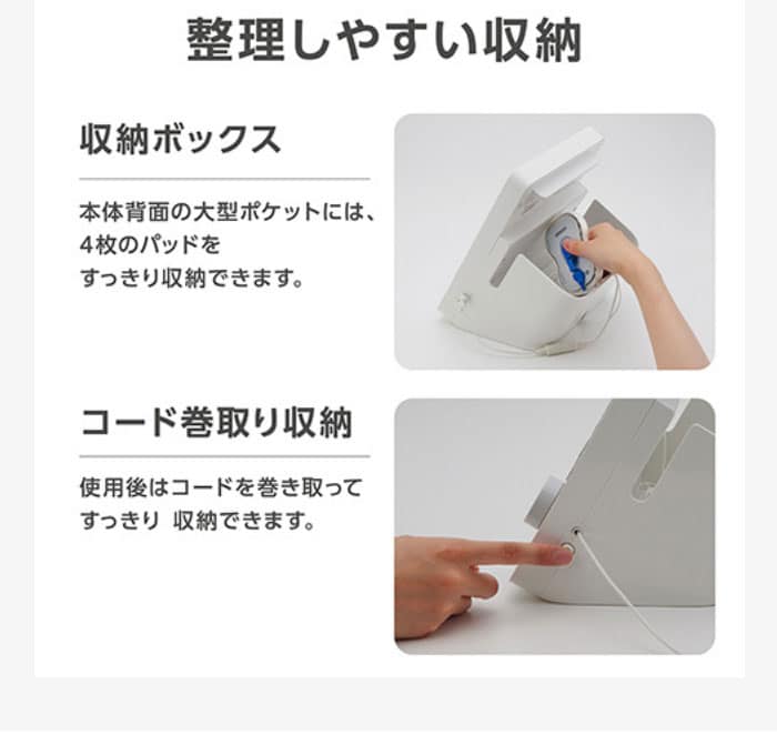 本体背面の収納ボックスに4枚のパッドとヒーターサポーターをまとめて収納できます。