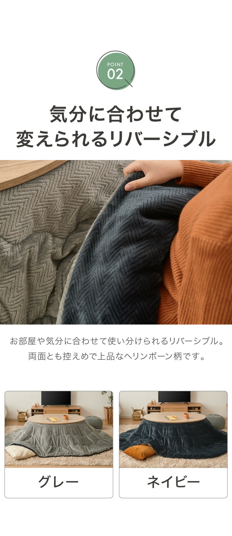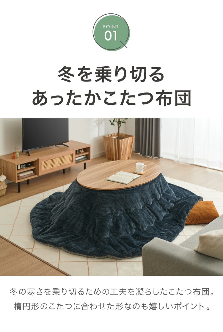リバーシブルの楕円形専用布団。ビーンズ型こたつ105サイズにも使えます。