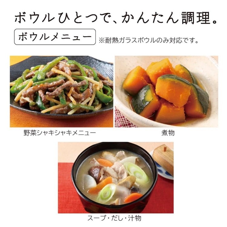 ●ボウルひとつで簡単調理「ボウルメニュー」(※1)。「野菜シャキシャキメニュー」や煮物やいため物など、ボウルひとつでメイン料理から副菜までつくれるので、レパートリーが広がります。(※1 耐熱ガラスボウルのみ対応です。)