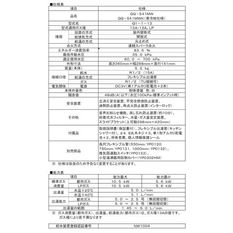 ■給湯:TG:10.5kW(9000kcal/h)、LPG:10.5kW(0.75kg/h)