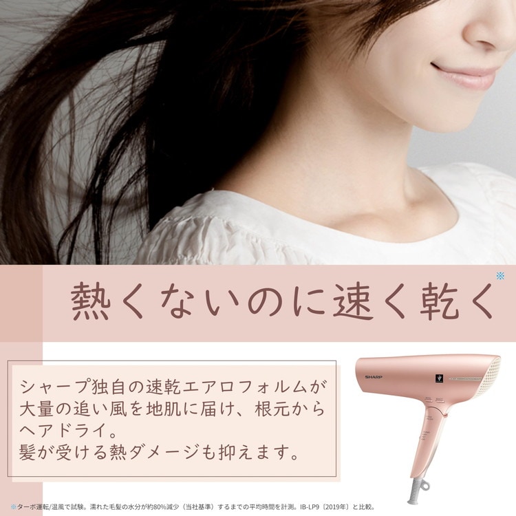 シャープ独自の速乾エアロフォルムが、大量の速い風を地肌に届け、髪を根本から乾かし、髪が受ける熱ダメージを抑えます。