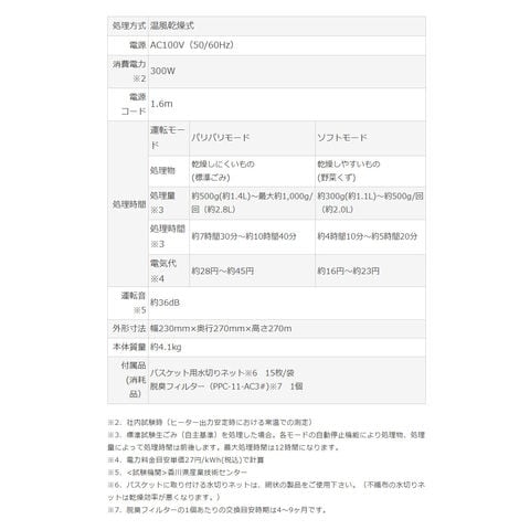 付属品(消耗品):バスケット用水切りネット※6 15枚/袋、脱臭フィルター(PPC-11-AC3#)※7 1個