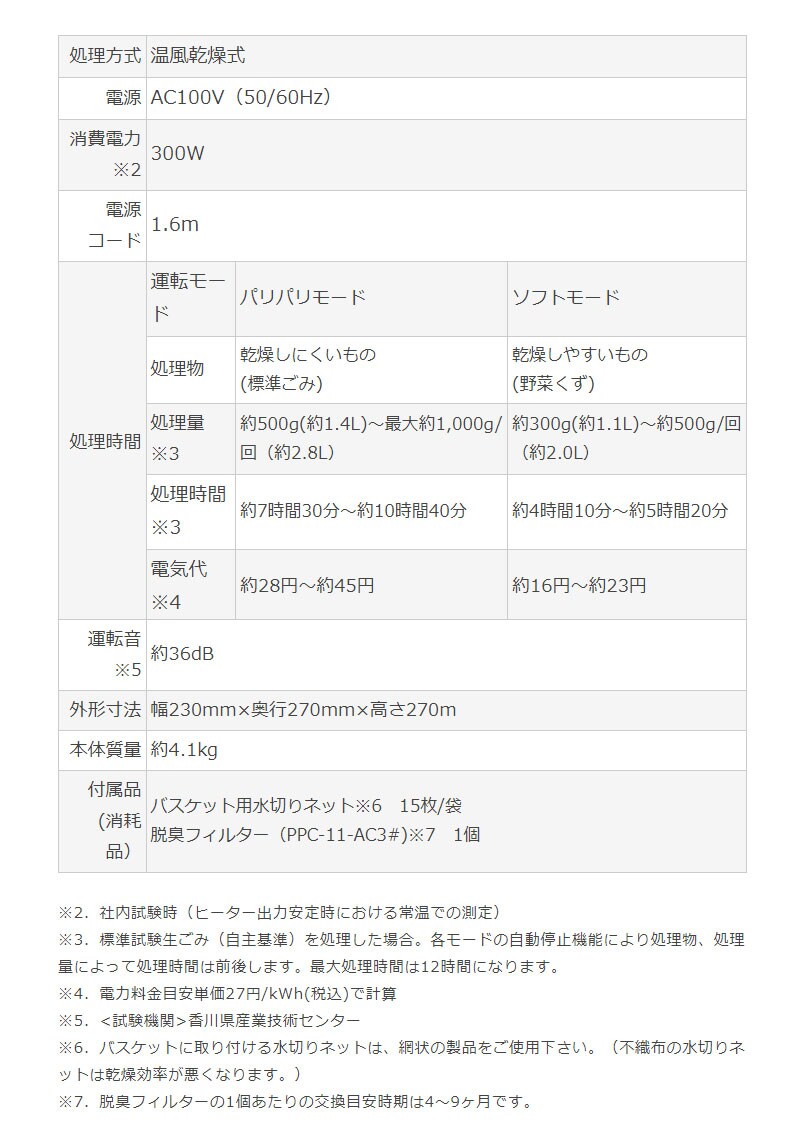 ※3.標準試験生ごみ(自主基準)を処理した場合。各モードの自動停止機能により処理物、処理量によって処理時間は前後します。最大処理時間は12時間になります。