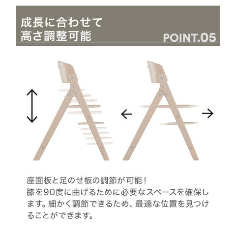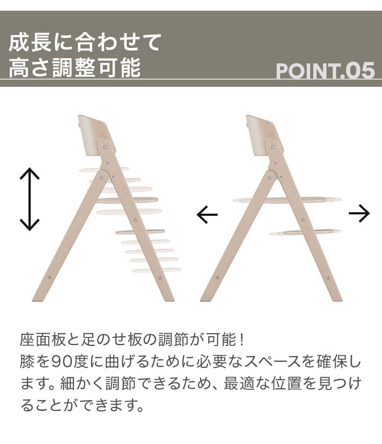 ・お子さまに合わせて座席の深さや足のせ板の調節が可能 など