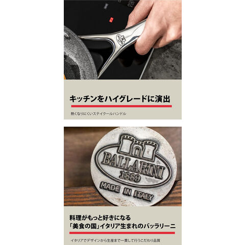 グラニチウムコーティングに調理中も熱くなりにくいステイクールハンドル。バッラリーニのスタンダードモデル。