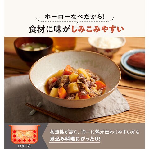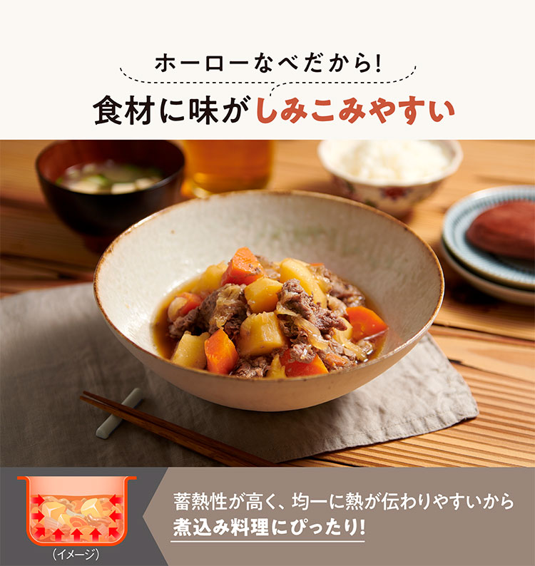 1.高い蓄熱性で味が染み込みやすいIH・ガス火OK「ホーローなべ」ホーローなべは熱が均一に伝わりやすく、熱が逃げにくいため、煮込み料理に適しています。また、傷がつきにくく、においが残りにくい特徴があり、おいしさと使いやすさを両立しています。IH・ガス火※1対応なので、冷蔵庫で保存した料理の温め直しなどに便利です。(※1ガス火はSiセンサーつきガスコンロに限ります。)