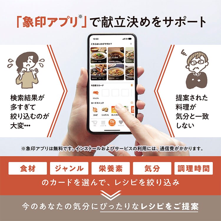 3.今の気分にぴったりなレシピ提案を。本体と連携し、献立決めをサポートする「象印アプリ」対応。「食材」・「料理」・「栄養素」・「気分」・「調理時間」の項目に応えると、多数あるレシピの中からあなたにぴったりの料理を提案します。また、調味料を入れるタイミングをお知らせしてくれる「調味料追加の通知機能」も搭載