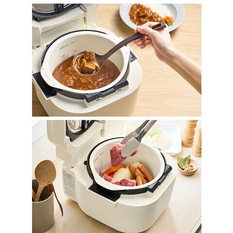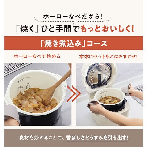 煮込む前に食材を“焼く”ことで、うまみと香ばしさを引き出し、おいしい煮込み料理に仕上がります。先にコンロなどでホーローなべに入れた食材を炒め、そのまま本体にセットするだけ。焼き煮込みコースを選択してスタートすれば、あとはおまかせ。