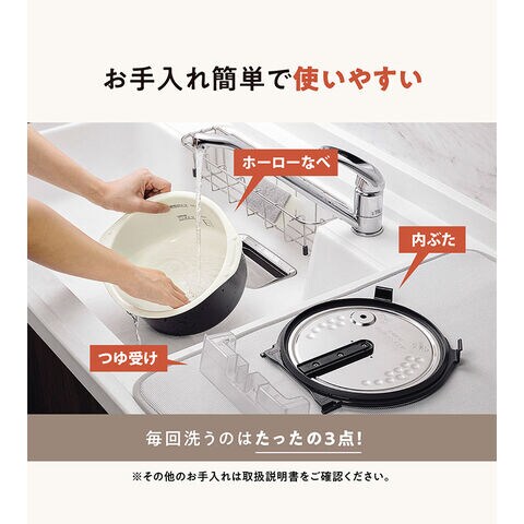 2.お手入れ簡単、毎回洗う点数はたったの3点。シンプルな構造だからお手入れ簡単。毎回洗うのは内ぶた・内なべ・つゆ受けのたったの3点だけです。