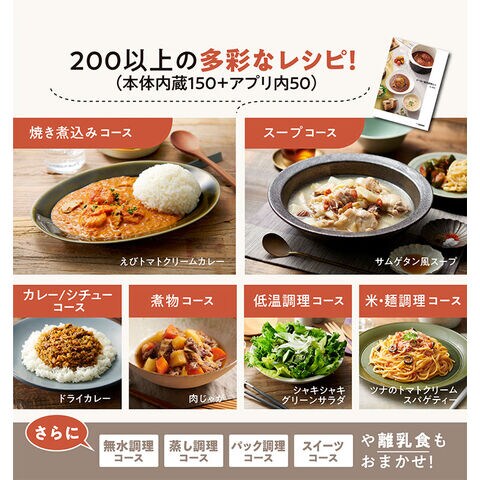 200種類のレシピ搭載(本体内蔵150レシピ+象印アプリ50レシピ)。アプリのレシピがどんどん増えていくので、さまざまな料理を楽しむことができます。