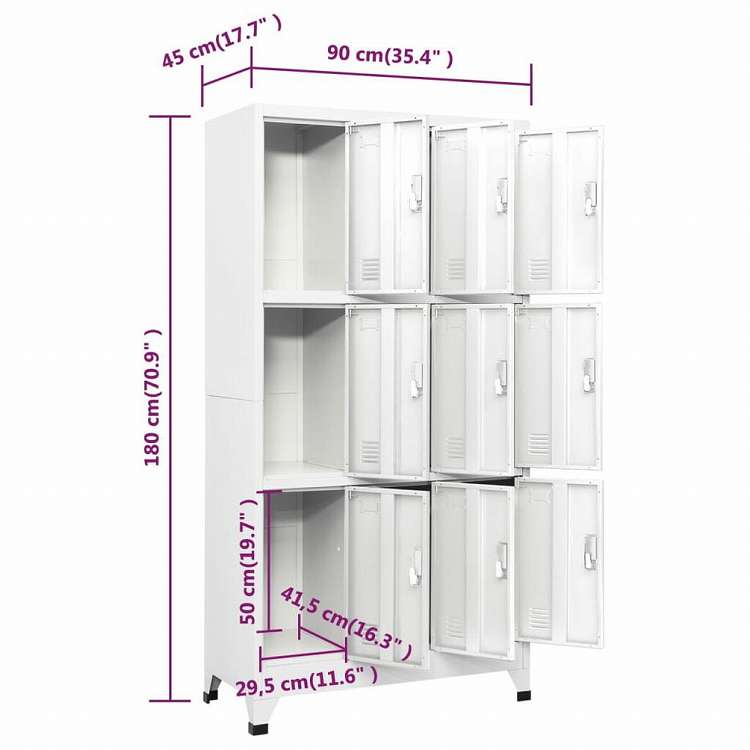 ■スポーツルームやオフィスでの更衣室に最適なロッカーキャビネット。単なるロッカーとはいえ、スタイリッシュでインダストリアルな雰囲気をオフィスや学校の空間にプラスします。 扉付き、9つの収納スペースがあり、各スペースには、服など、私物を安全に保管できます。また各収納箇所に、鏡、名前カードホルダーが付属しています。床面防傷用のプラスチック面も付属しています。 このオフィスキャビネットは高品質なスチール製で、耐久性があり、お手入れも簡単です。組み立ては簡単です。