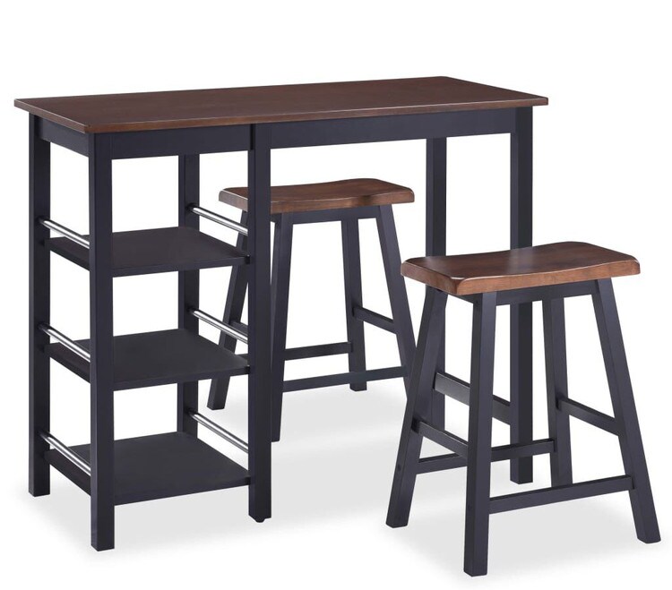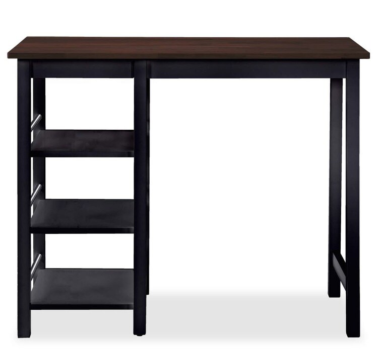 オーソドックスなデザインのバーセットは、テーブル1点とスツール2点で構成されています。キッチンやダイニングルームにぴったりです。「コロニアル」時代をイメージした、クラシックなデザイン感。洗練された、ダークな色合いのMDFと頑丈なラバーウッドの造りが特徴です。大きなバーテーブルには、片側に3つの棚を備え、キッチン用品や日用品を収納するのに役立ちます。手の届く範囲だから、便利です。バースツールには、人間工学に基づいて設計された、シートを設けました。