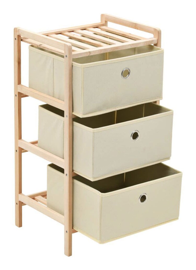 別々の布製バスケット3点を備えた、無垢の杉製の収納ラック。日常生活に必要なアイテムをまとめて収納するスペースを十分備えています。木製の収納ユニットは軽量で、ご自宅のどこにでも簡単に設置できます。引き出しは明るい生地でできており、インテリアをちょっぴりエレガントに惹き立てます。この収納ラックは組み立ては簡単です。